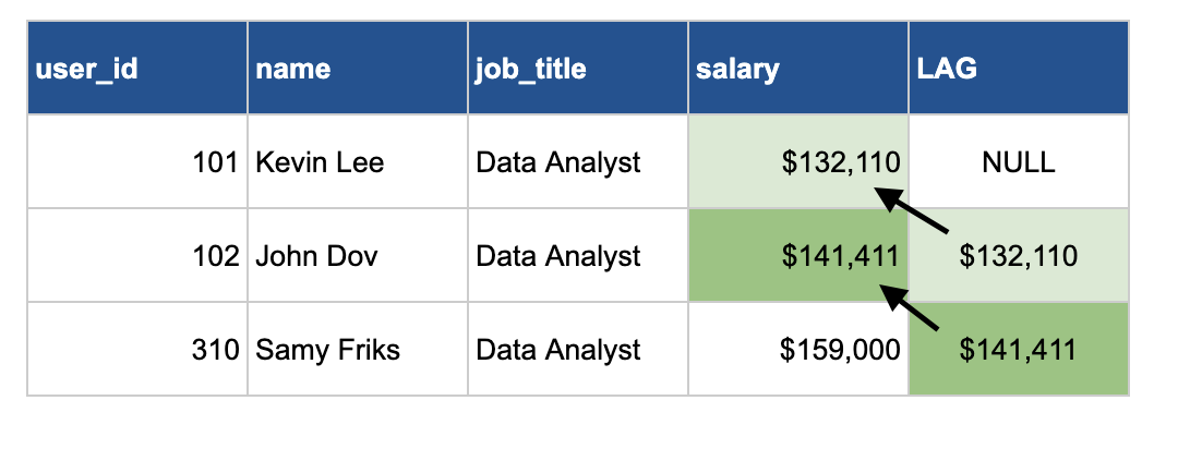 As we can see here, for Kevin Lee, first row, there is no value prior to that, so the LAG value will be null. For John Dov, second row, his salary is 132,110. So the LAG function will grab the value of the previous row, from Kevin's Lee salary. Same for that 3rd row, it will grab the value of John Dov's salary.